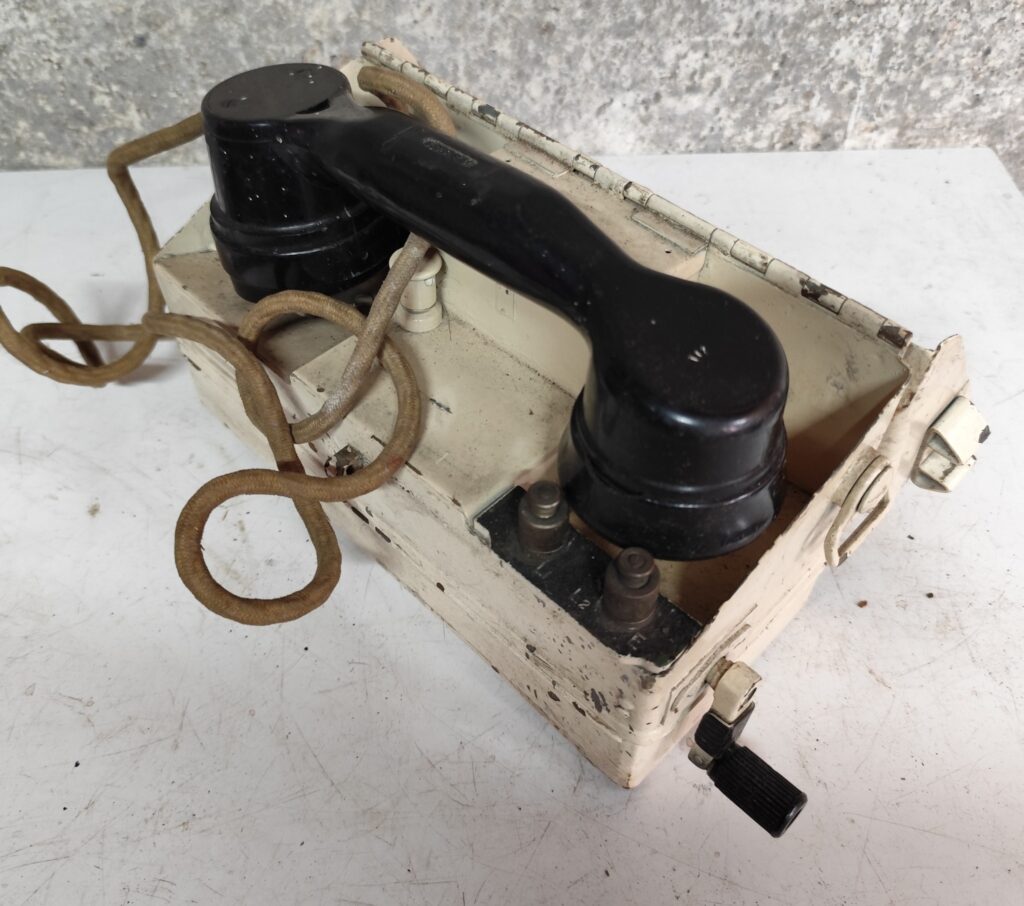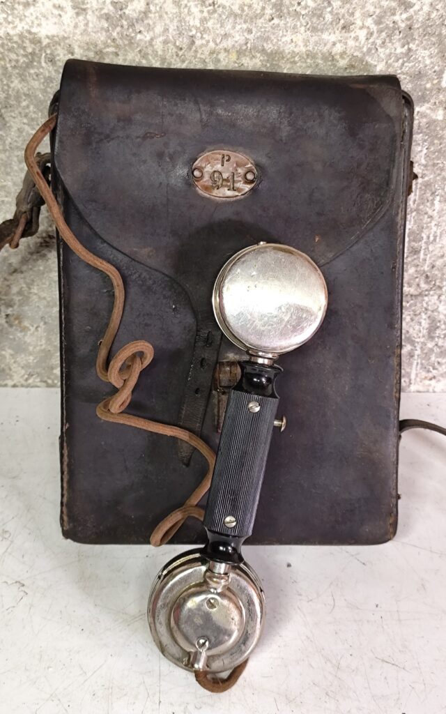 Téléphone de campagne avec sa sacoche en cuir, début 20eme, le combiné est magnifique, il s’agit d’un objet extrêmement rare