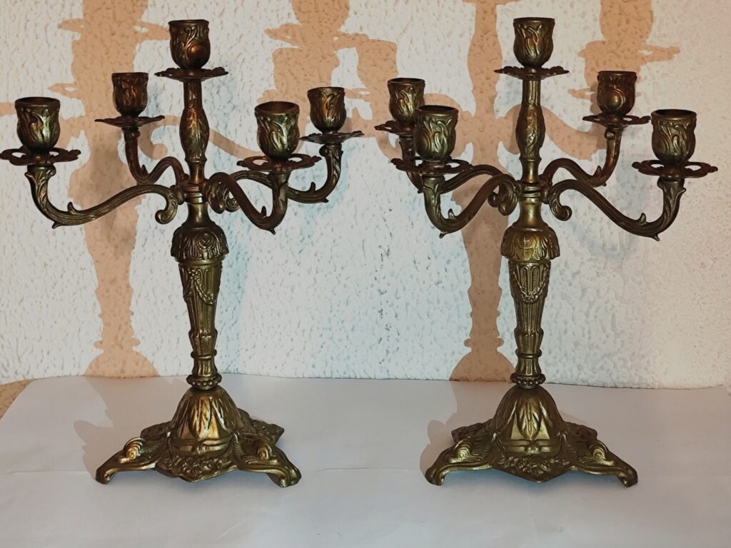 transformez votre intérieur avec cette somptueuse paire de candélabres à cinq bras au style classique et raffiné. Idéal pour une décoration de table, un salon au cachet vintage ou une mise en scène théâtrale.