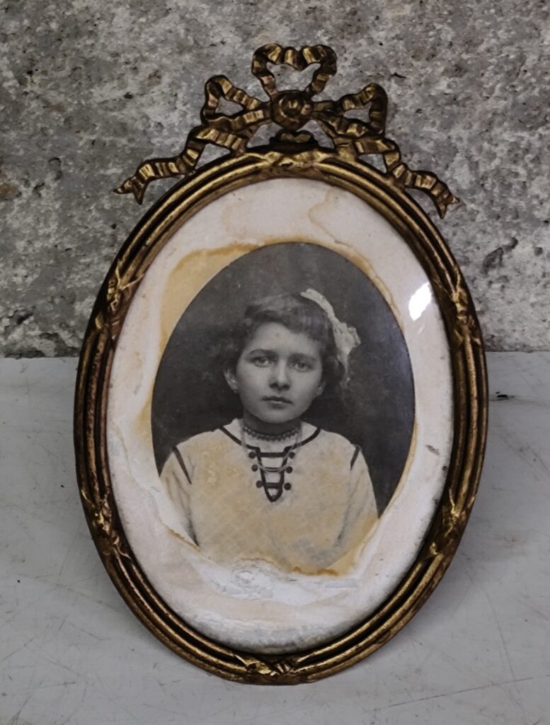 Cadre ovale en bronze à ruban , avec un verre bombé, hauteur 16 cm, vous pourrez remplacé la photo ou la conserver ; c’est à vous de voir