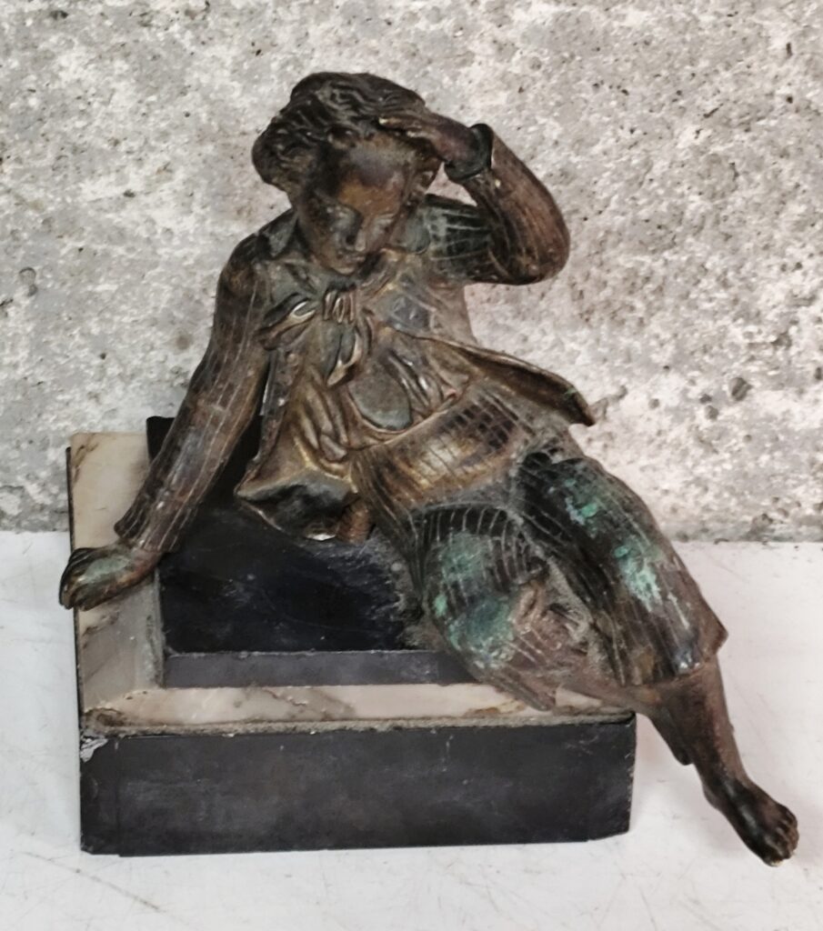 Joli régule sur marbre, hauteur 15 cm, représentant un jeune homme assis dans une posture contemplative. Travail délicat, patine d’origine avec traces de vert-de-gris, témoignant de son âge et de son authenticité. Monté sur un socle à étages mêlant marbre et pierre noire,