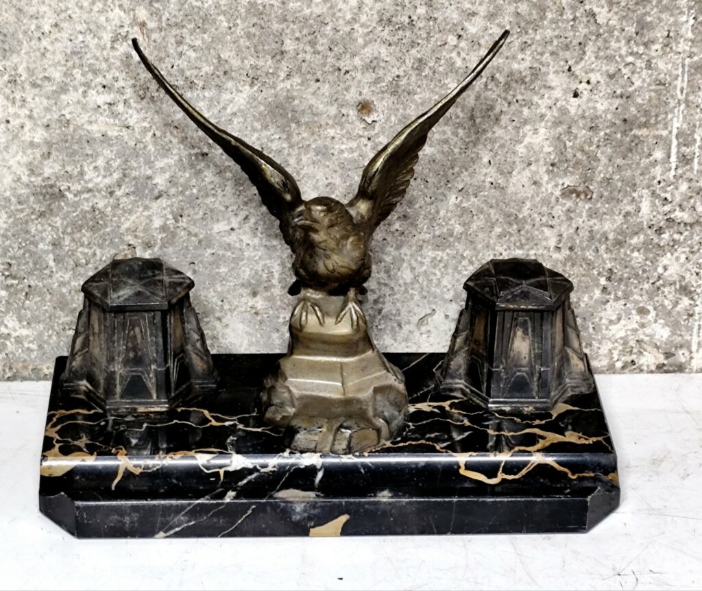 Superbe encrier décoratif en régule patiné, représentant un aigle majestueux aux ailes déployées, perché sur un socle rocailleux. Encadré de deux encriers à couvercles, le tout reposant sur une base en marbre noir veiné . Pièce de caractère, avec un petit coté empire , pour collection ou décoration raffinée.longueur 27 cm