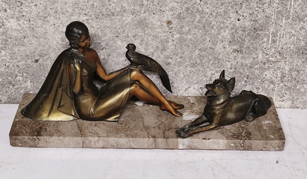 Élégante scène animalière en régule patiné, représentant une femme assise tenant un faisan, accompagnée d’un chien allongé, attentif et paisible. Travail raffiné des années 1930 socle en marbre veiné, belle harmonie entre les personnages et les matières. Un bel objet décoratif, idéal pour les amateurs d’art déco, de chasse ou de sculptures animalières.