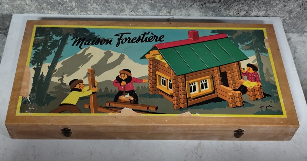 Jeu d construction en bois CHALET SUISSE, malgré le ruban adhésif sur le dessus de la boite cela reste un très bel objet